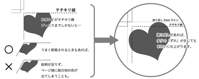 塗り足し部分はもちろん、ページ内のタチキリ線付近にも、切れては困るものは配置しないようにしましょう。