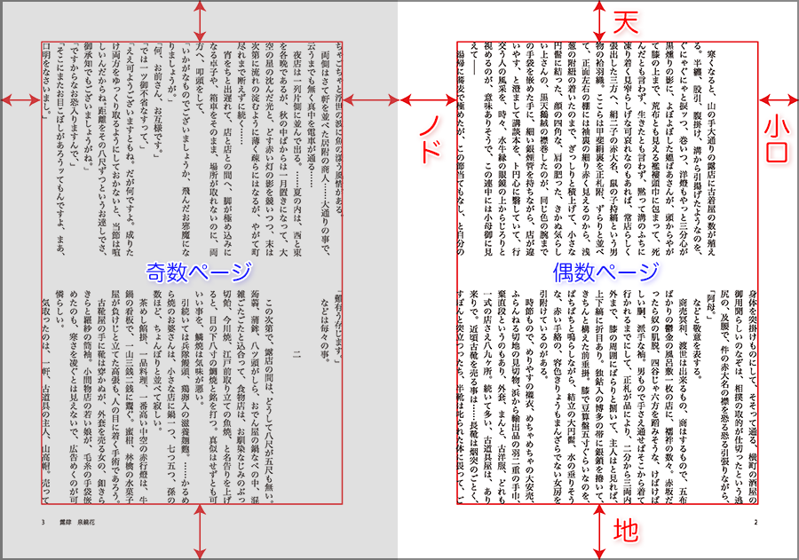 ノドは本を綴じる側のこと。反対にページをめくる側のことを小口と言います。