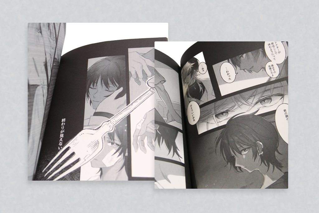 ※オンデマンド印刷のマット感優先でご依頼いただくと、黒一面でもテカリが少ない仕上がりになります。モノクロやトーンの表現方法に合わせて、オンデマンドでの印刷仕様はお好みでお選びください。