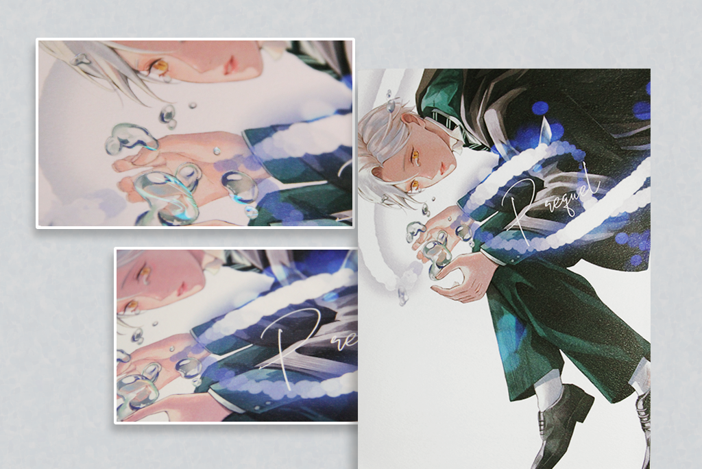 ウォーターセレクト(透明)の箔は質感の上に鮮やかな彩りを与え、透明感を保ちつつ奥行きをもたらしてくれます。周囲に流れる青の光と共に、それぞれの輝きは美麗で繊細なキャラクターを一層引き立てます。